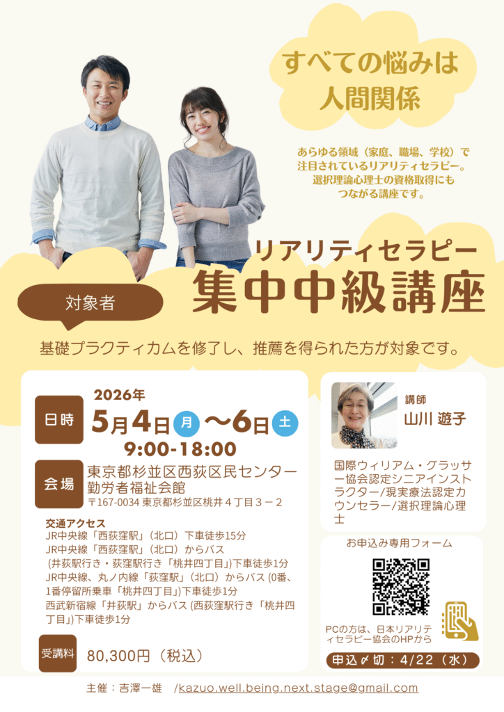 この度、山川遊子先生をお招きして「リアリティセラピー集中中級講座」を弊社代表吉澤が初めて主催させていただくことになりました。
