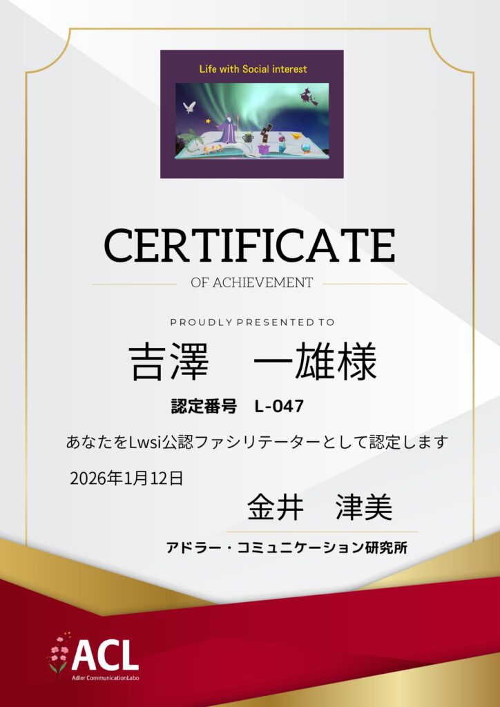 アドラー心理学の共同体感覚を楽しく学び体現するLife with Social interest カードゲーム:LwSi (ルーシー) のファシリテーター認定講座を受講し、1月12日に認定をいただきました。